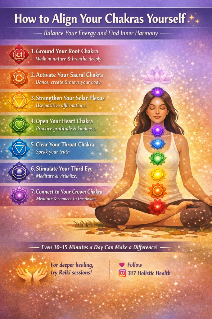 Aligning your chakras does not require hours of practice. Even dedicating 10 to 15 minutes a day to meditation, movement, or mindful breathing can begin to shift your energy. Many people find that combining these practices with activities like yoga, sound healing, or Reiki can help deepen the alignment process.